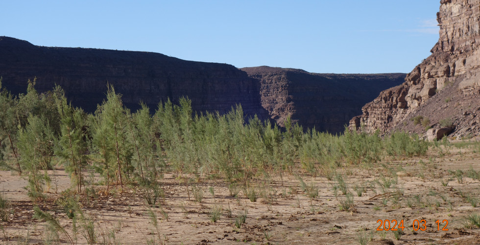 At the mouth of the canyon upstream from the rocky escarpments, the largest river bed of the property boasts strong water tables and abundant shrubs and bushes. The area attracts springbok, steenbok and other smaller mammals. Experiments with wobblers and intermittent watering have brought greener grass. We also notice that it is shorter than at the drier surroundings, marker of the delicate attention from mammals towards tender shoots.